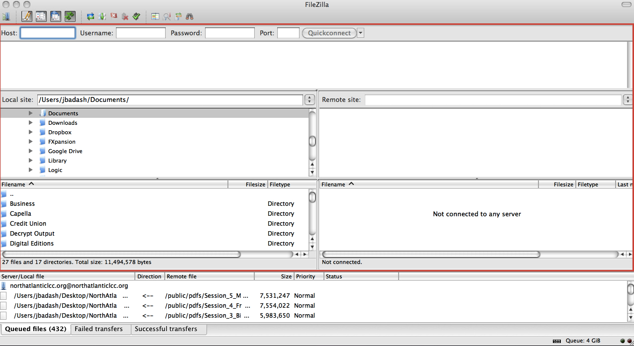 Screenshot of FileZilla's opening window. The area that we will using the most is enclosed in the red box: