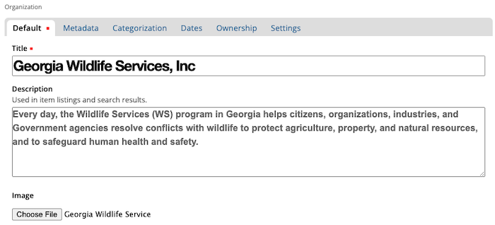 Image of Organization Title, Description, and Image fields for How to Add an Organization tutorial.