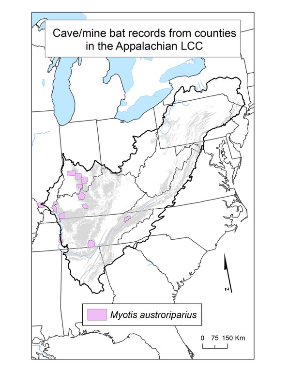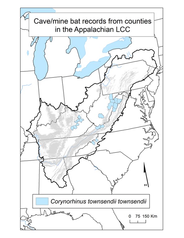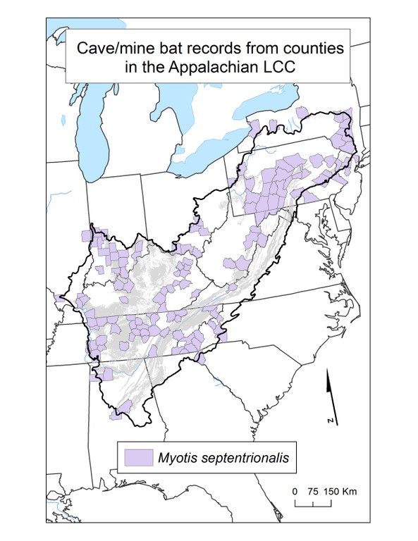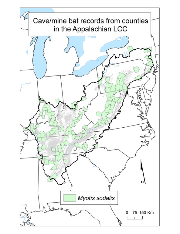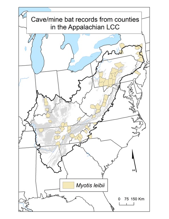 The utilization of caves by bats is quite different from other cave dwelling species. No bat spends its entire life in a cave, and during the summer, those species that roost leave at night to forage for food, primarily insects. Some species also hibernate in caves, and overall there is a varying degree of dependency on caves as a physical habitat. Many species are also found in mines, because some mines and caves are very similar habitats to bats. In the study area, there are ten species of bats that depend on caves and mines. This folder contains maps of the county scale distribution of bat species (a total of 10) which were considered.