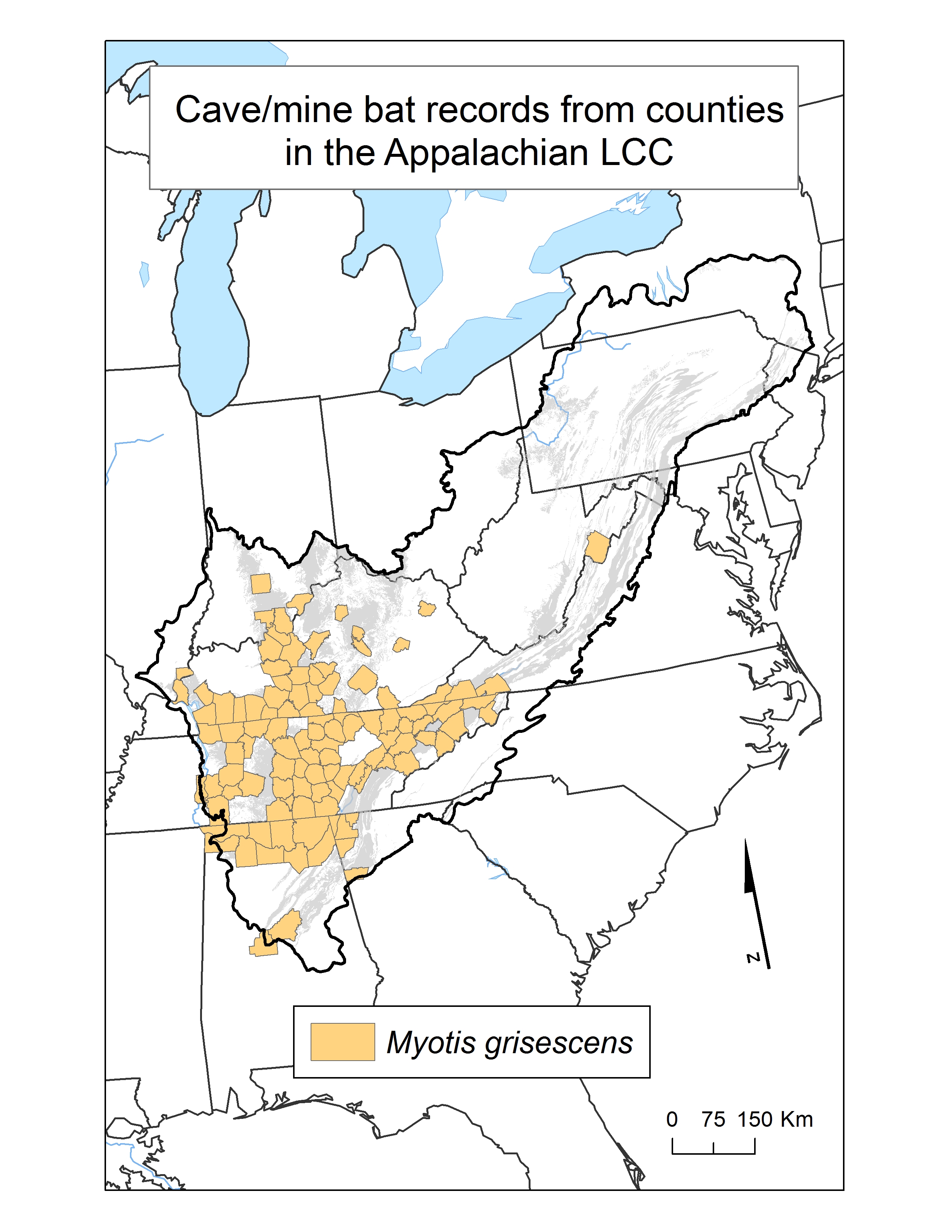 Distribution map of counties with a cave/mine occurrence for the gray bat (Myotis grisecens) within the Appalachian LCC region.
