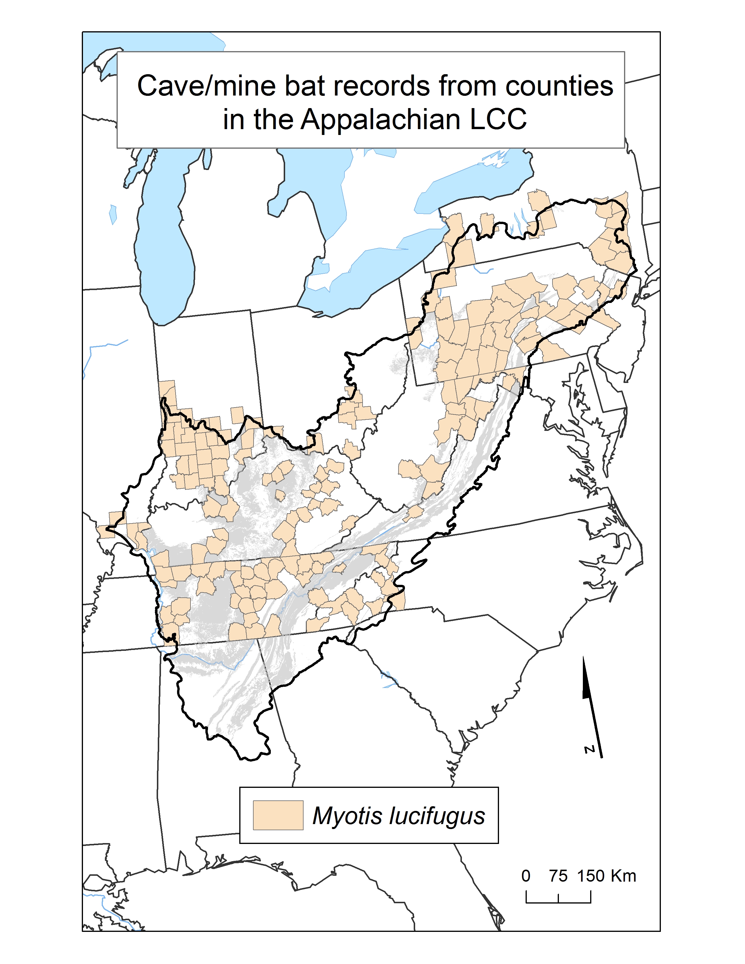 Distribution map of counties with a cave/mine occurrence for little brown bat (Myotis lucifugus) within the Appalachian LCC region.