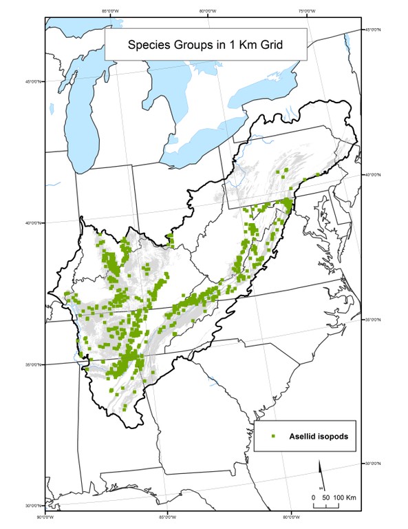 Since there were too many species (710) or even genera (131) to analyze within the scope of this project, a functional ecological approach was utilized. The ranges of nine ecological groups were analyzed, including; predaceous ground beetles, millipedes, pseudoscorpions, springtails, spiders, amphipods, isopods (Asellidae), crayfish, and fish. Collectively, they are the best studied and most abundant stygobionts and troglobionts. Species within each group have very similar ecological roles, so interesting generalities should emerge about the conditions under which they are found. The number of species in each group ranges from 164 (beetles) to four (fish).