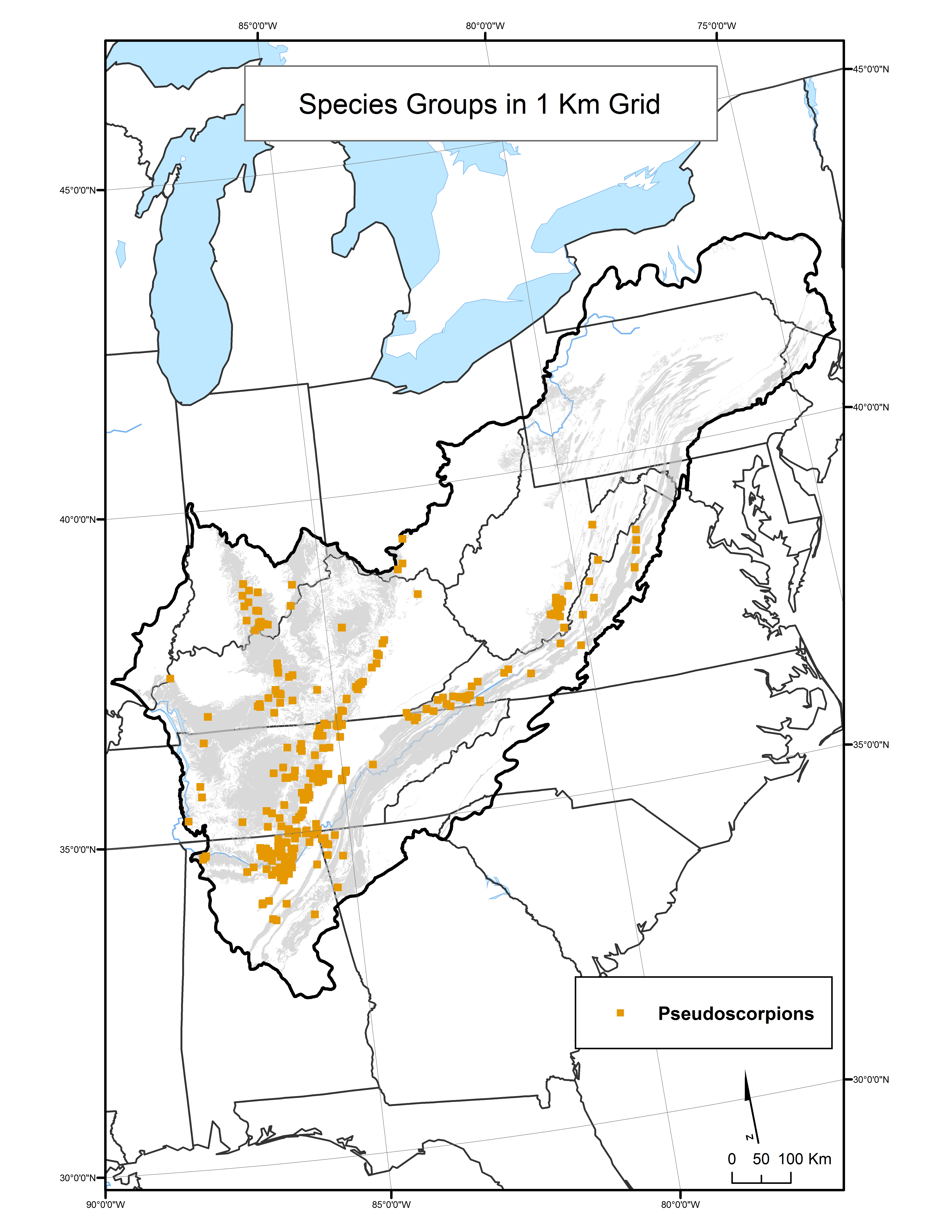 Distribution of pseudoscorpion spcies distribution by 1 kilometer grid throughout the Appalachian LCC region.