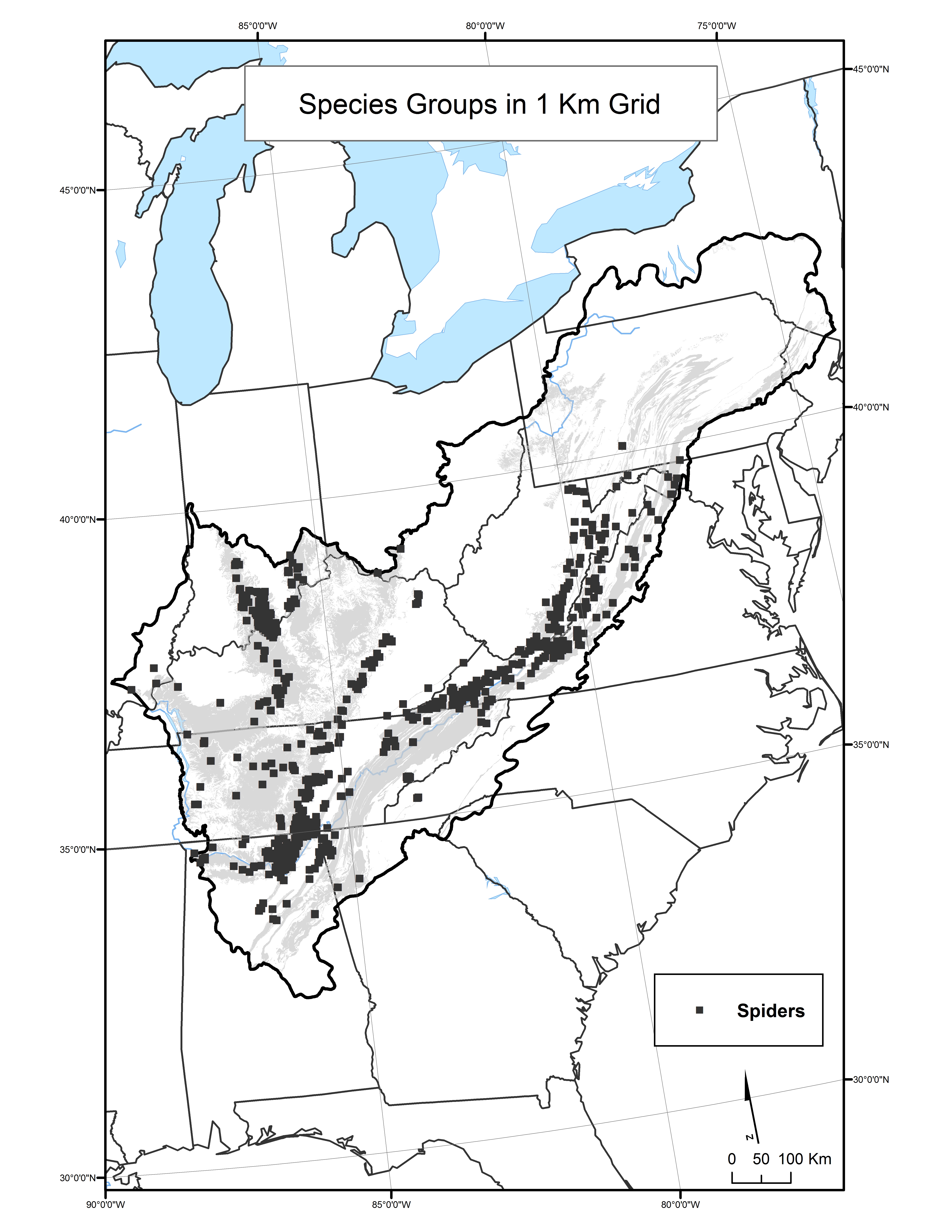 Distribution of spider species by 1 kilometer grid throughout the Appalachian LCC region.