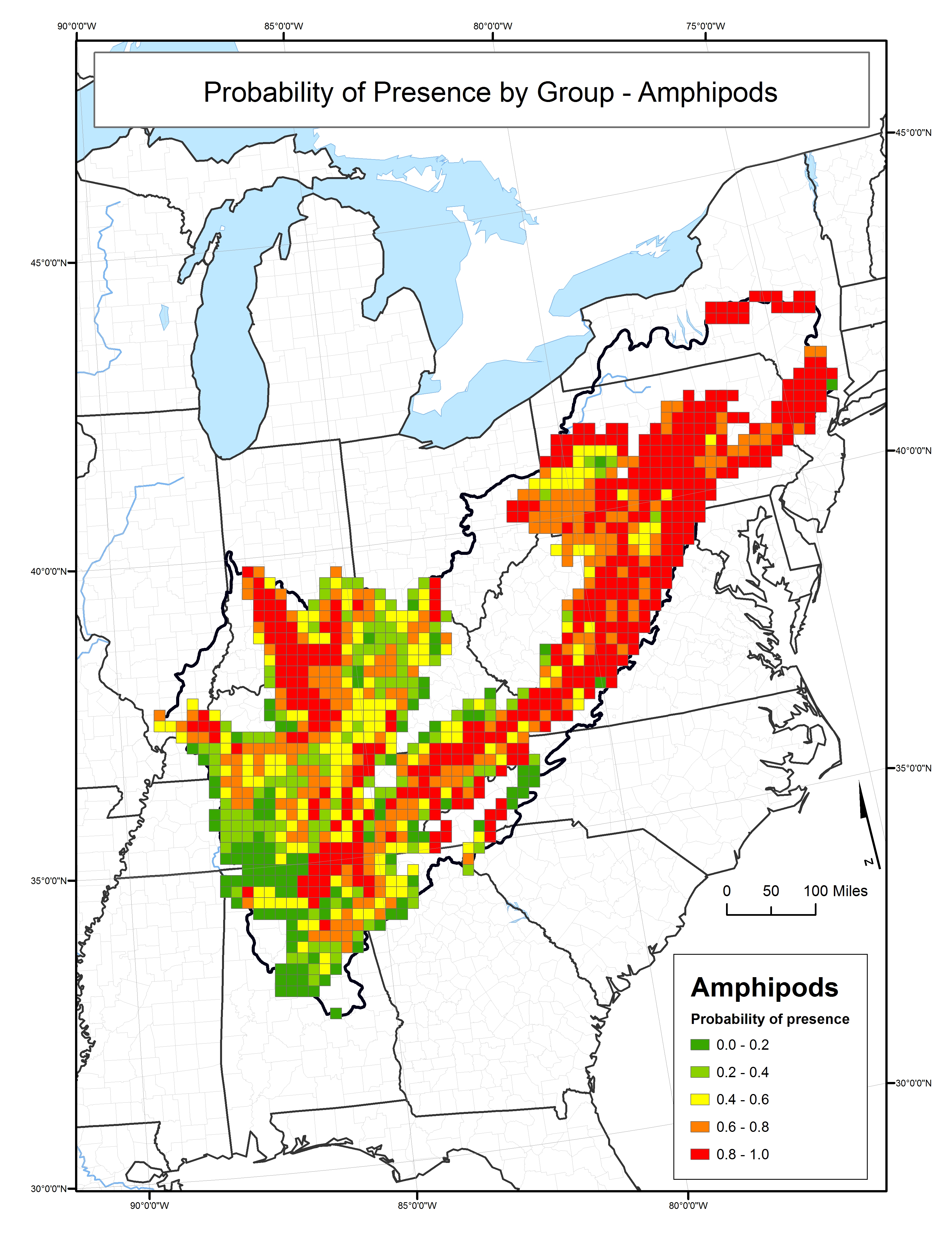 This map depicts the probability of presence for species within the amphipod group throughout the Appalachian LCC region. Red areas have the highest probability of presence.