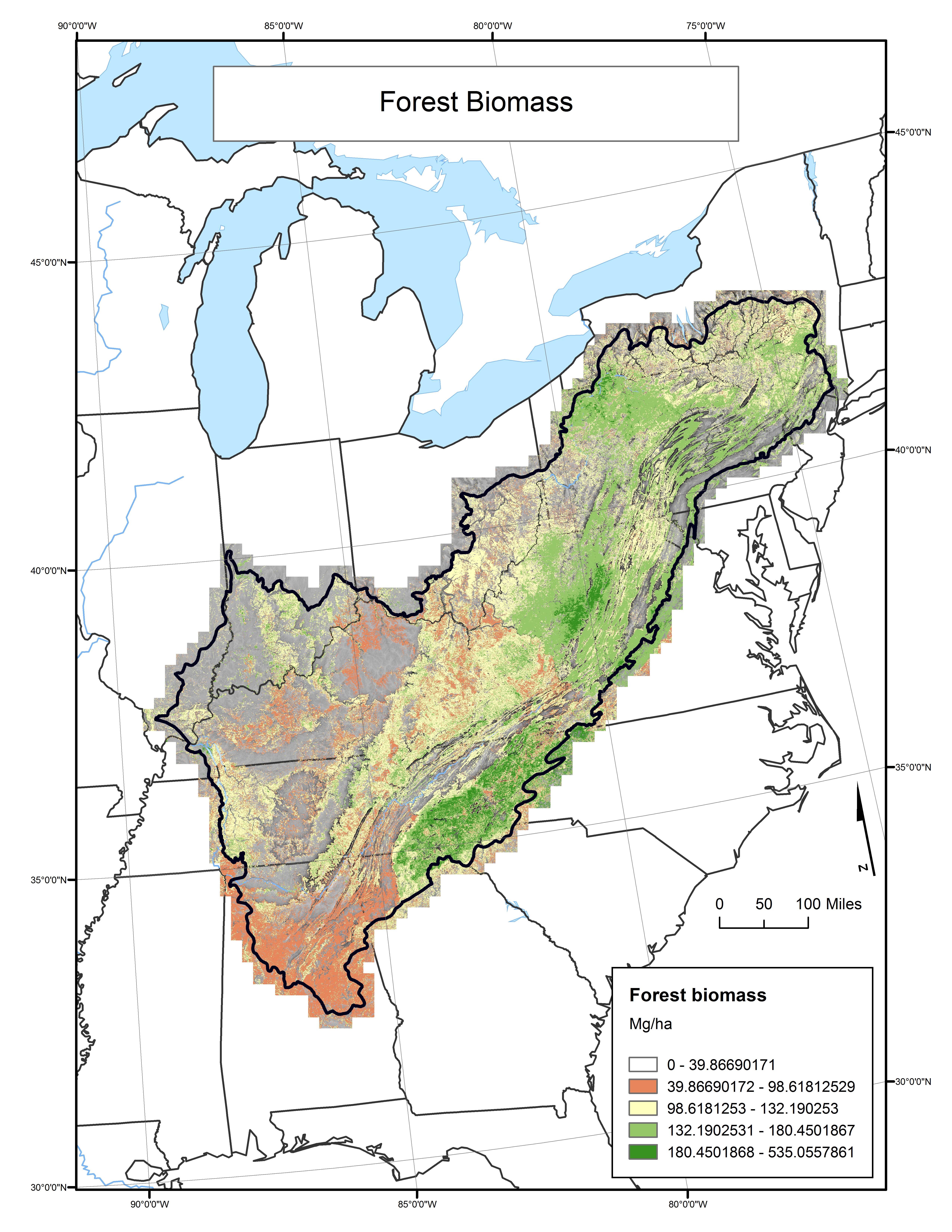 Forest biomass at the 1 kilometer scale throughout the Appalachian LCC region.