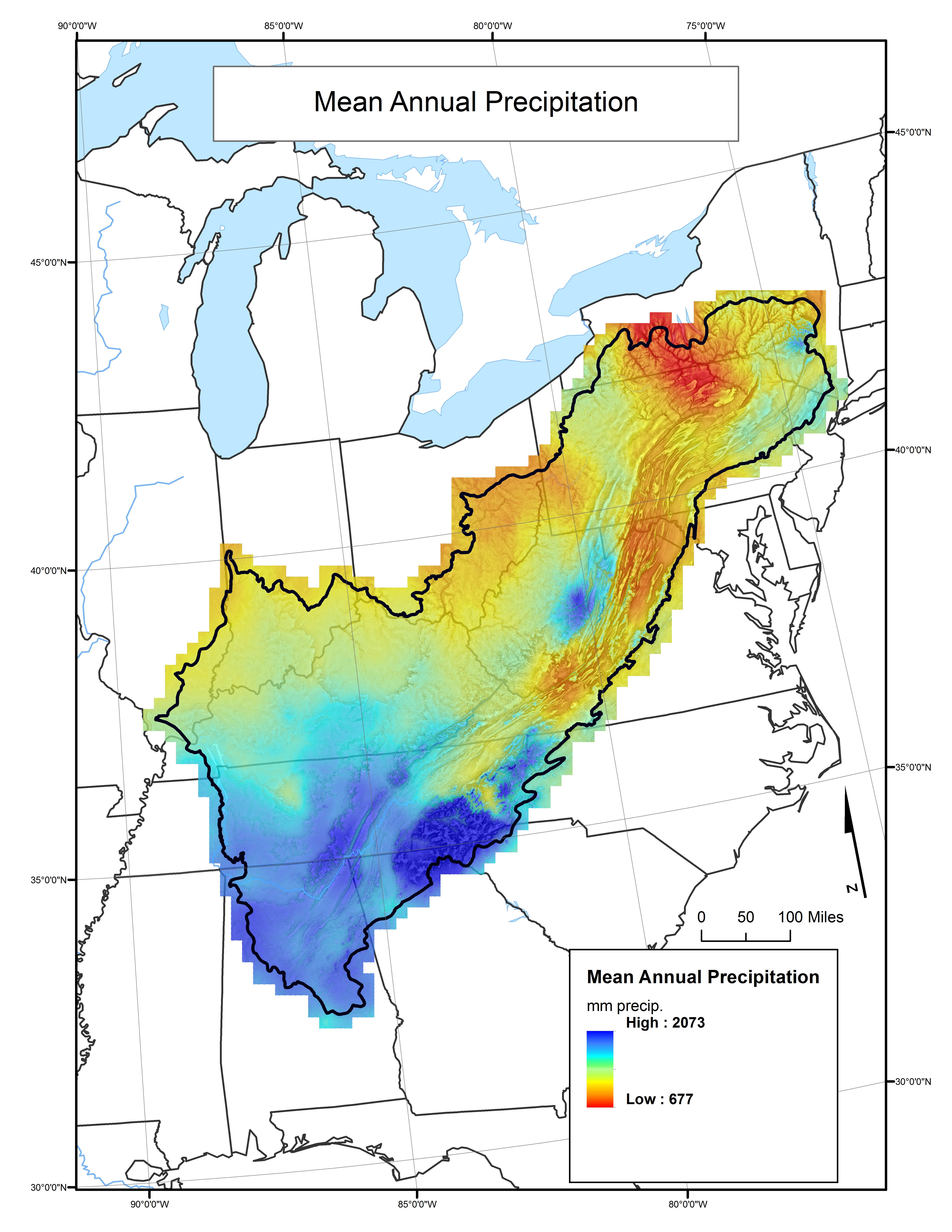 Mean annual precipitation (mm/year) at a 1 kilometer resolution throughout the Appalachian LCC region.