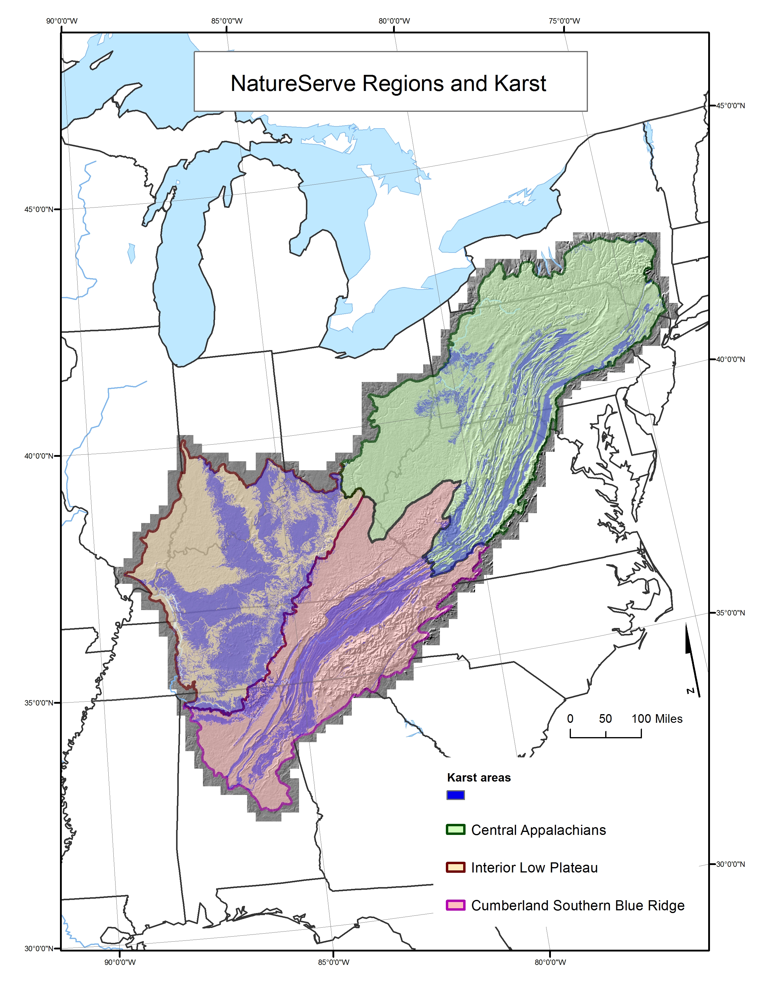 Three basic regions are identified by NatureServe; Interior Low Plateaus,Central Appalachians, and Cumberland Southern Blue Ridge. These ares are displayed along with karst resources within the Appalachian LCC region.