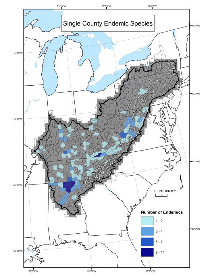 Number of endemic species at the county level throughout the Appalachian LCC region.