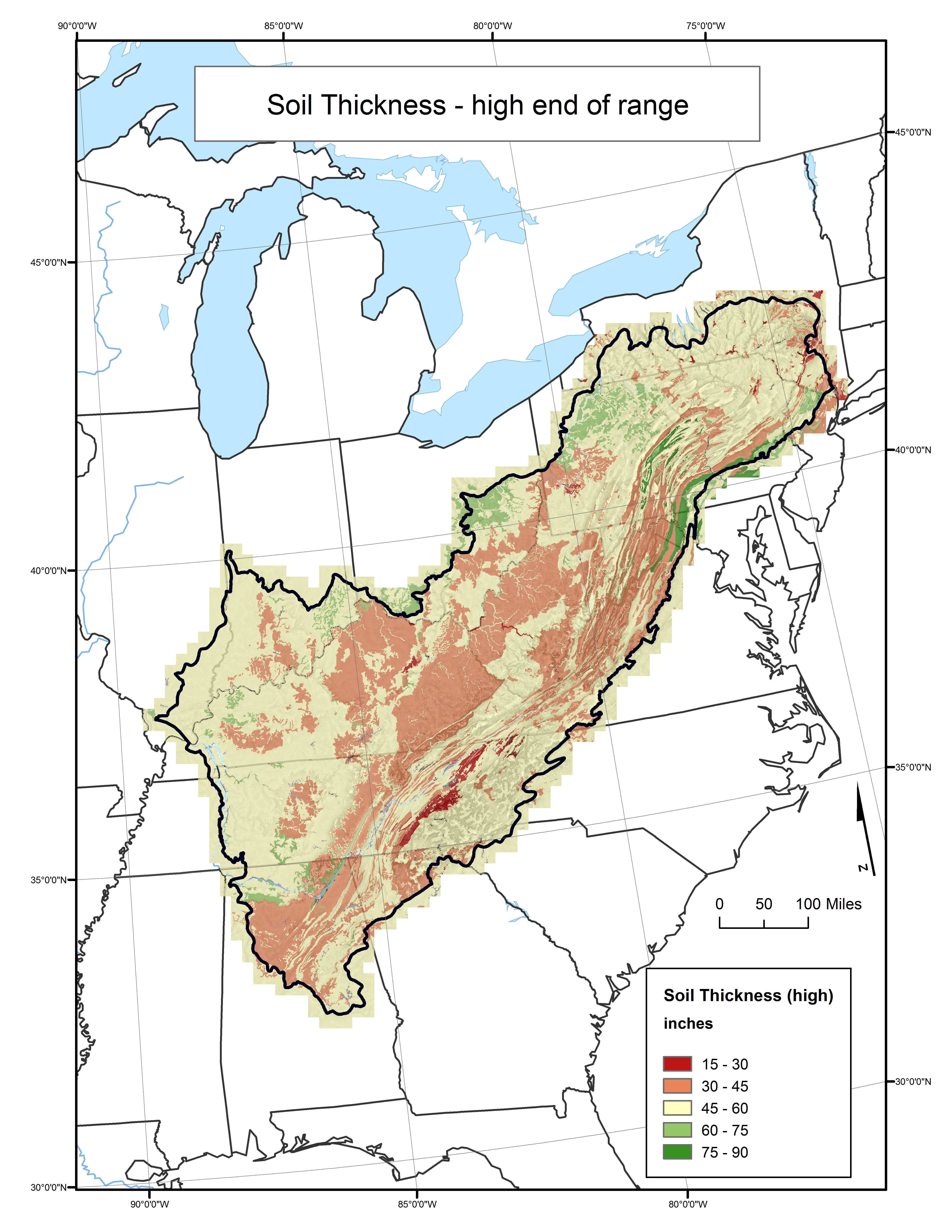 High end of range of soil thickness at 1 kilometer resolution throughout the Appalachian LCC region.