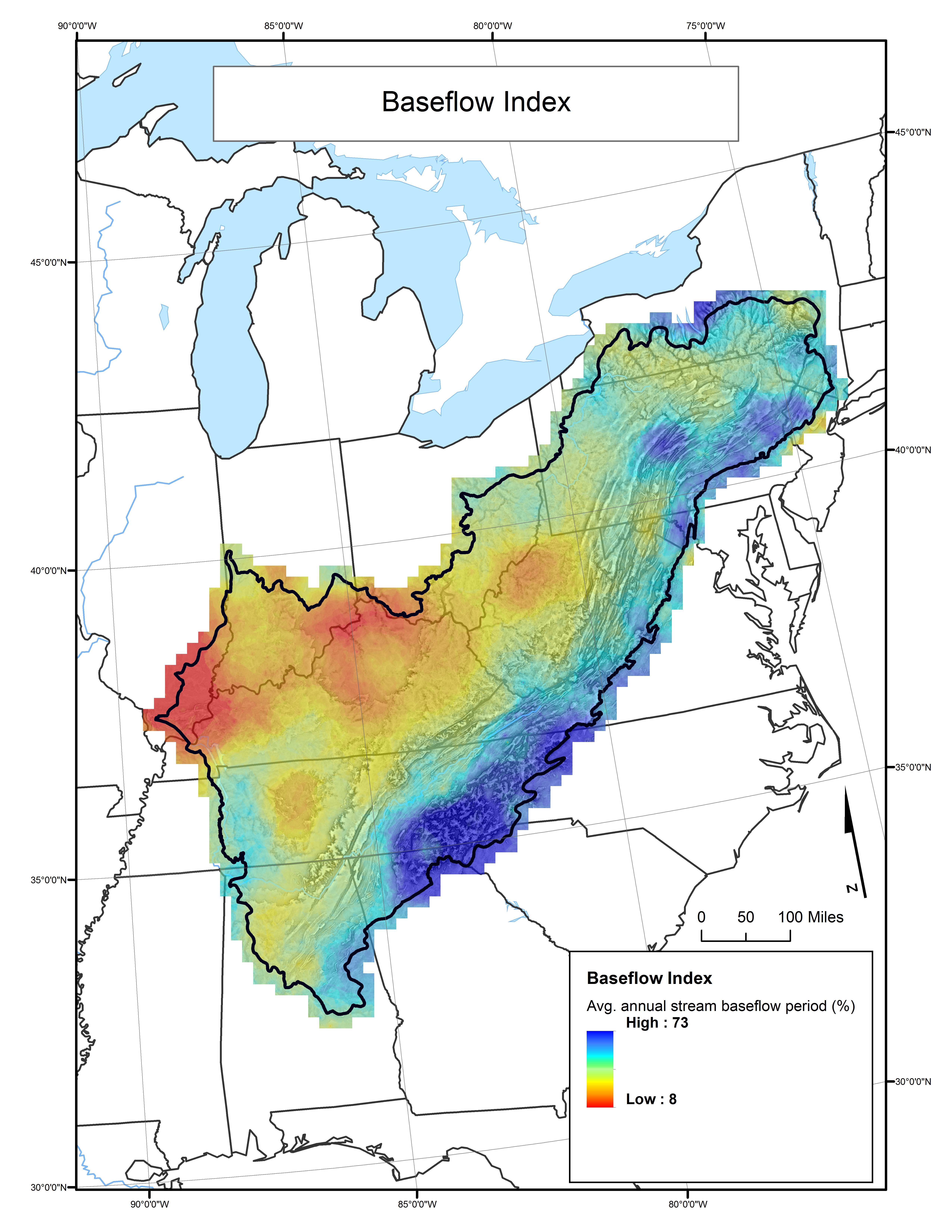 Average annual stream baseflow index at 1 kilometer resolution throughout the Appalachian LCC region.