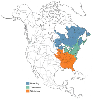 Distribution of the American Black Duck. This species breeds locally South to the dashed line.